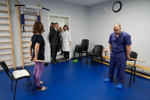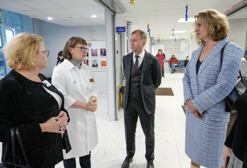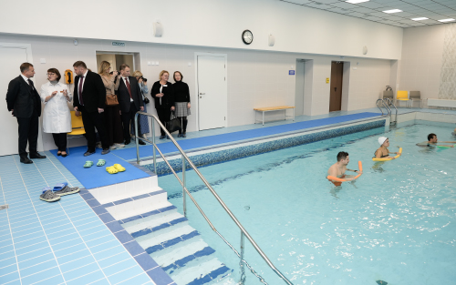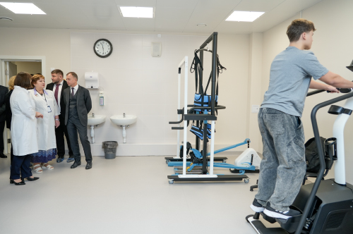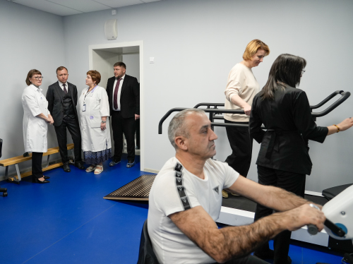 Руководители осмотрели реабилитационное отделение поликлиники, где пациенты с поражениями центральной нервной системы, опорно‑двигательного аппарата, органов дыхания и системы кровообращения проходят лечение по индивидуальным программам. Руководитель отделения Оксана Зарайская продемонстрировала современное реабилитационное оборудование, тренажёрный зал для лечебной физкультуры, бассейн и кабинеты для роботизированной механотерапии — комплексы, необходимые для возвращения пациентов к активной жизни.