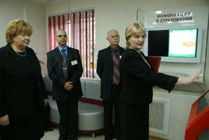 В начале зала терминал, через который посетители записываются на получение полиса. К нему подошла Ольга Александровна Казанская, вице-губернатор Санкт-Петербурга, которая приехала на открытие пункта. Ольга Александровна не успела нажать на кнопку, только выполз из терминала талон, а уже приветливый голос приглашает к специалисту. Информация дублируется и на световом табло.