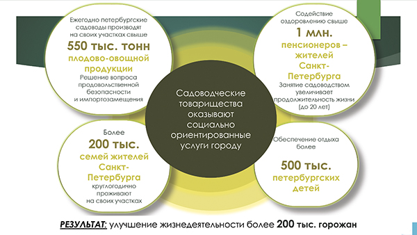 Андрей Лях сообщил, что в настоящее время на территории Санкт-Петербурга и Ленинградской области расположены свыше 3 тысяч садоводств, насчитывающих около 700 тыс. участков.